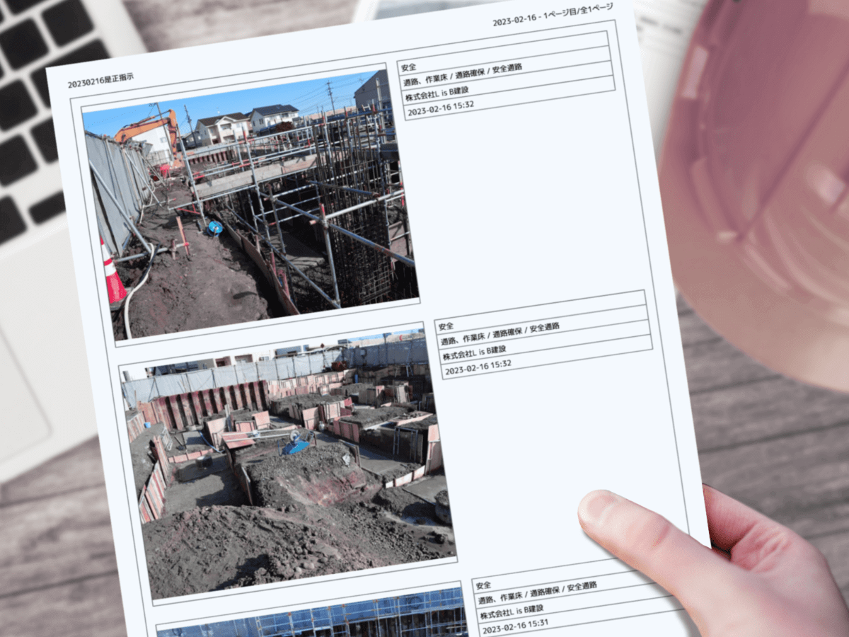 写真を選択するだけで簡単に帳票を作成できます。タグ情報や黒板情報、日時やタスクの担当者などの情報の表示・非表示も可能。一度に最大200枚の写真を、ページごとに1〜3枚表示した帳票が作成できます。作成した帳票はPDF・Excelファイルで出力できます。